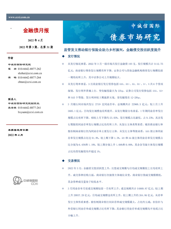 【中诚信国际】【202204】中诚信-金融债月报2022年4月-13页 行业研究