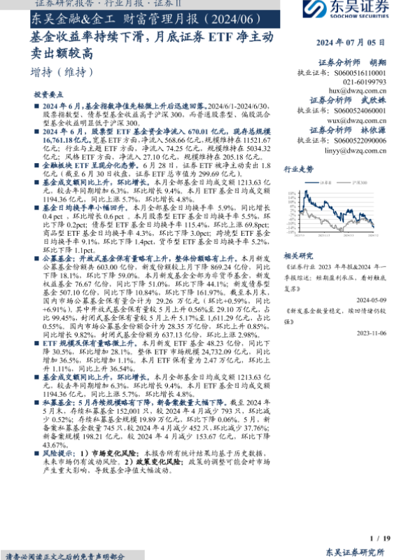 【东吴证券】【20240705】东吴金融&金工财富管理月报:基金收益率持续下滑,月底证券ETF净主动卖出额较高-19页 行业研究