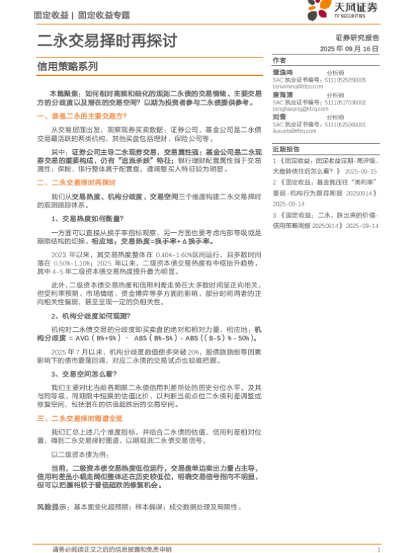 【天风证券】【202509】信用策略系列:二永交易择时再探讨-12页 证券期货研究报告