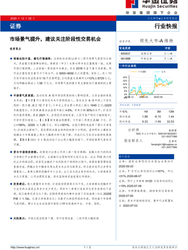 【华金证券】【20201202】证券行业快报:市场景气提升,建议关注阶段性交易机会-3页 行业研究