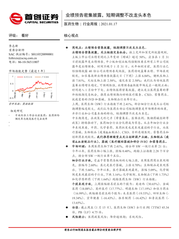 【首创证券】【20210117】医药生物行业周报:业绩预告密集披露,短期调整不改龙头本色-10页 行业研究