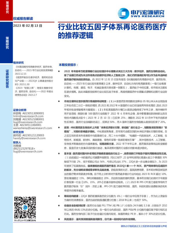 【申万宏源】【20230213】行业比较五因子体系再论医药医疗的推荐逻辑-17页 行业研究