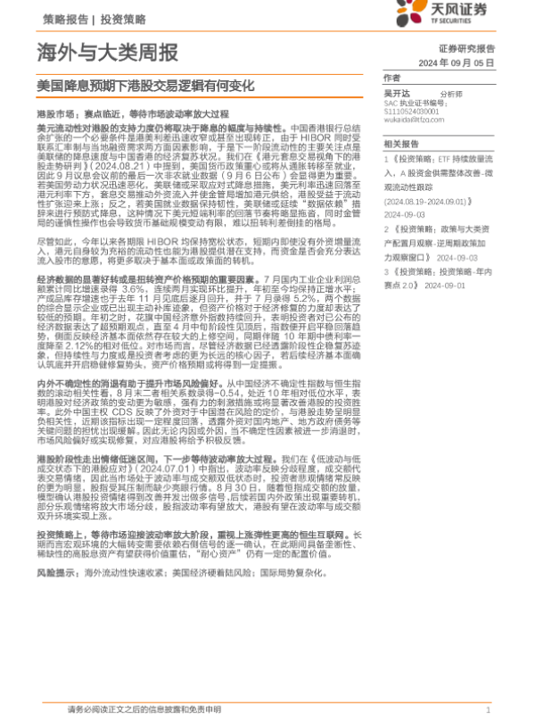 【天风证券】【20240905】海外与大类周报:美国降息预期下港股交易逻辑有何变化-14页 行业研究
