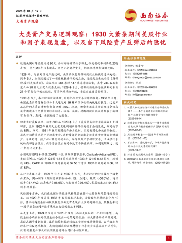 【西南证券】【20250417】大类资产交易逻辑观察:1930大萧条期间美股行业和因子表现复盘,以及当下风险资产反弹后的隐忧-10页 宏观策略