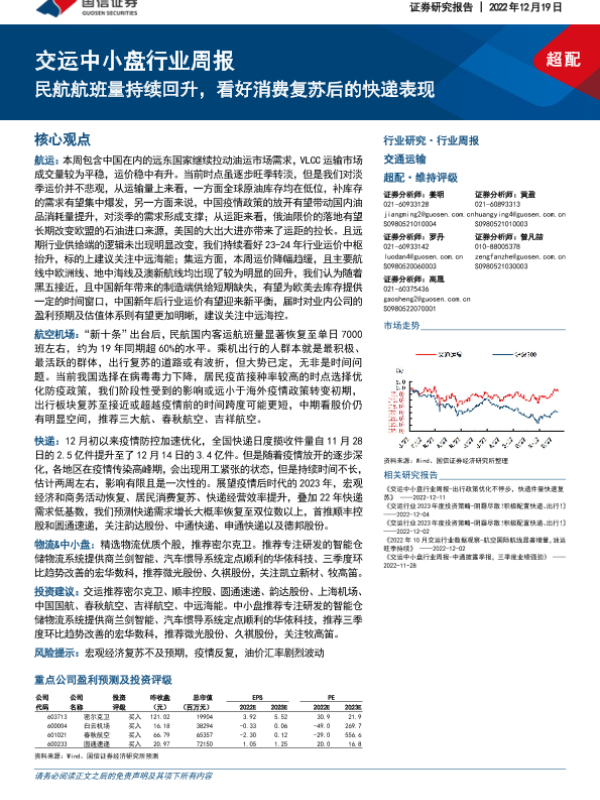 【国信证券】【20221219】交运中小盘行业周报:民航航班量持续回升,看好消费复苏后的快递表现-25页 行业研究