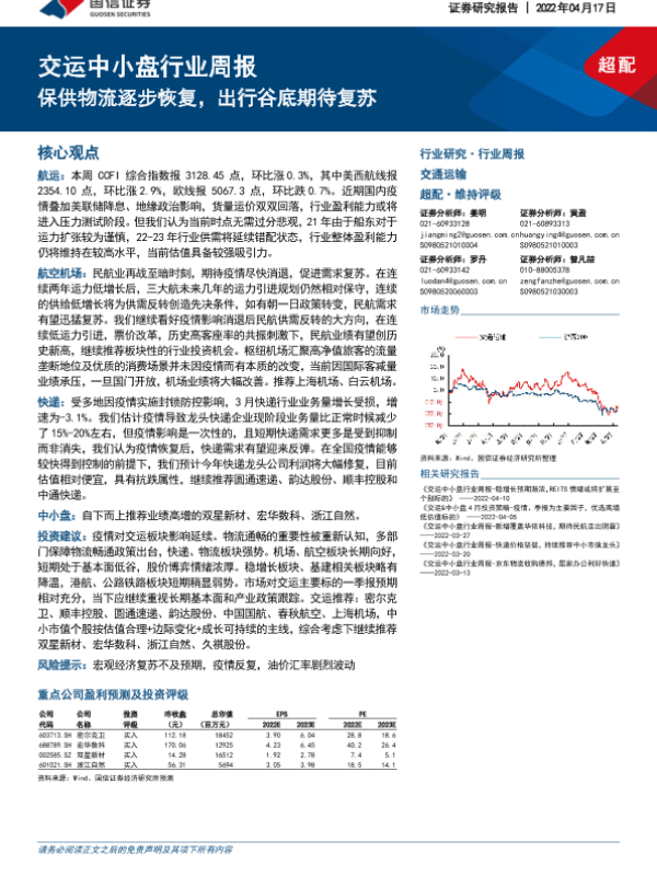 【国信证券】【20220417】交运中小盘行业周报:保供物流逐步恢复,出行谷底期待复苏-28页 行业研究
