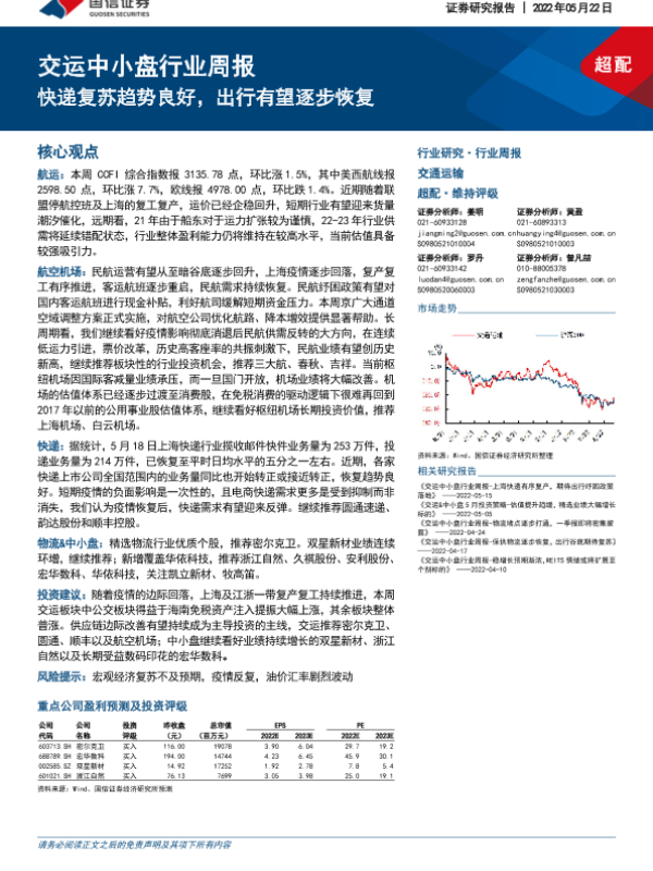 【国信证券】【20220522】交运中小盘行业周报:快递复苏趋势良好,出行有望逐步恢复-23页 行业研究