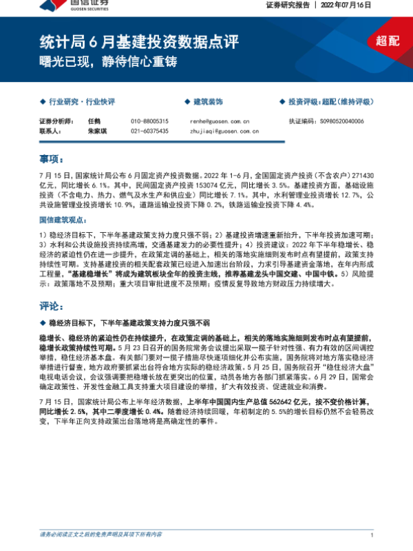 【国信证券】【20220716】统计局6月基建投资数据点评:曙光已现,静待信心重筑-7页 行业研究