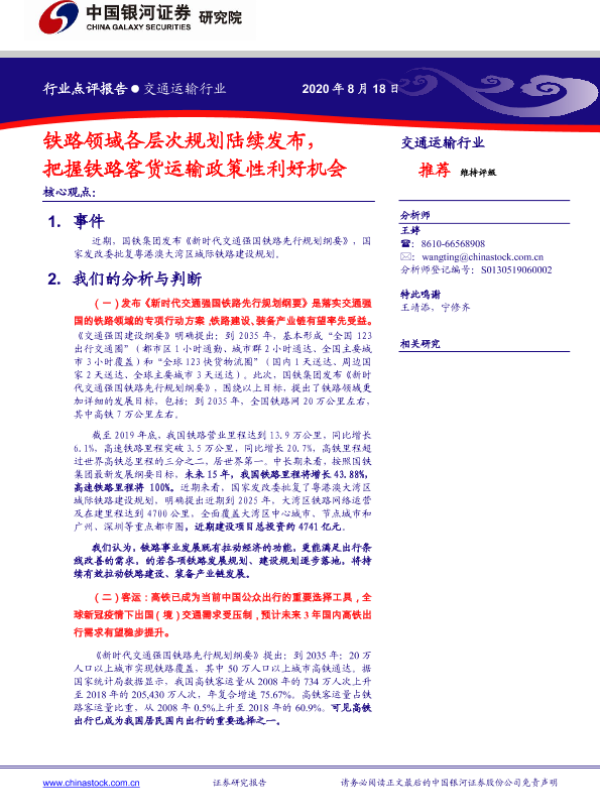 【银河证券】【20200818】交通运输行业点评报告:铁路领域各层次规划陆续发布,把握铁路客货运输政策性利好机会-5页 行业研究
