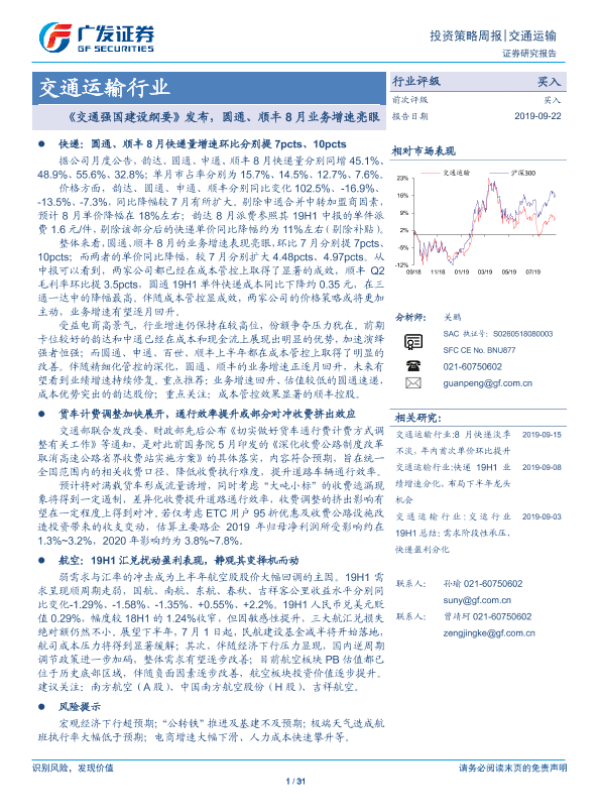 【广发证券】【20190922】交通运输行业投资策略周报:《交通强国建设纲要》发布,圆通、顺丰8月业务增速亮眼-31页 行业研究