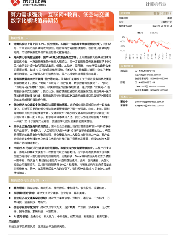 【东方证券】【20240807】20240807-东方证券-计算机行业行业周报:算力需求强劲,互联网+教育、低空与交通数字化领域值得期待-13页 行业研究