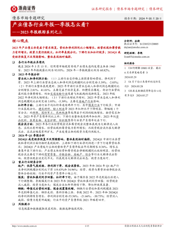 【浙商证券】【20240529】2023年报跟踪系列之三:产业债各行业年报一季报怎么看?-15页 行业研究