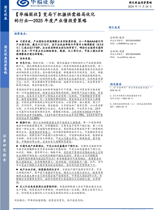 【华福证券】【20241124】【华福固收】2025年度产业债投资策略:变局下把握供需格局优化的行业-14页 行业研究