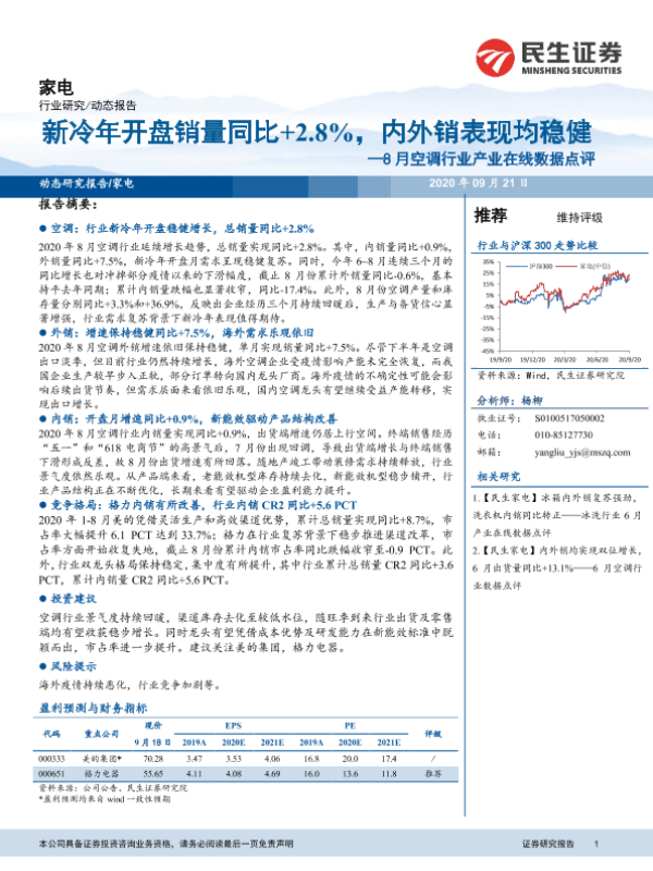 【民生证券】【20200921】20200921-民生证券-家电动态报告:8月空调行业产业在线数据点评-新冷年开盘销量同比+2.8%,内外销表现均稳健-9页 行业研究