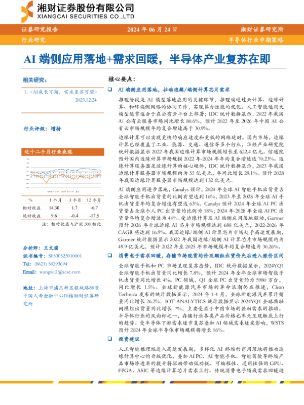【湘财证券】【20240624】AI端侧应用落地+需求回暖,半导体产业复苏在即-29页 行业研究