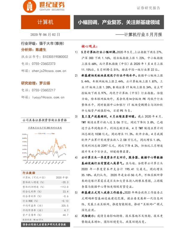 【世纪证券】【20200602】计算机行业5月月报:小幅回调,产业复苏,关注新基建领域-22页 行业研究
