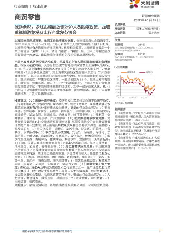 【天风证券】【20220626】多城市相继放宽对沪人员防疫政策,加强重视旅游免税及出行产业复苏机会-6页 行业研究