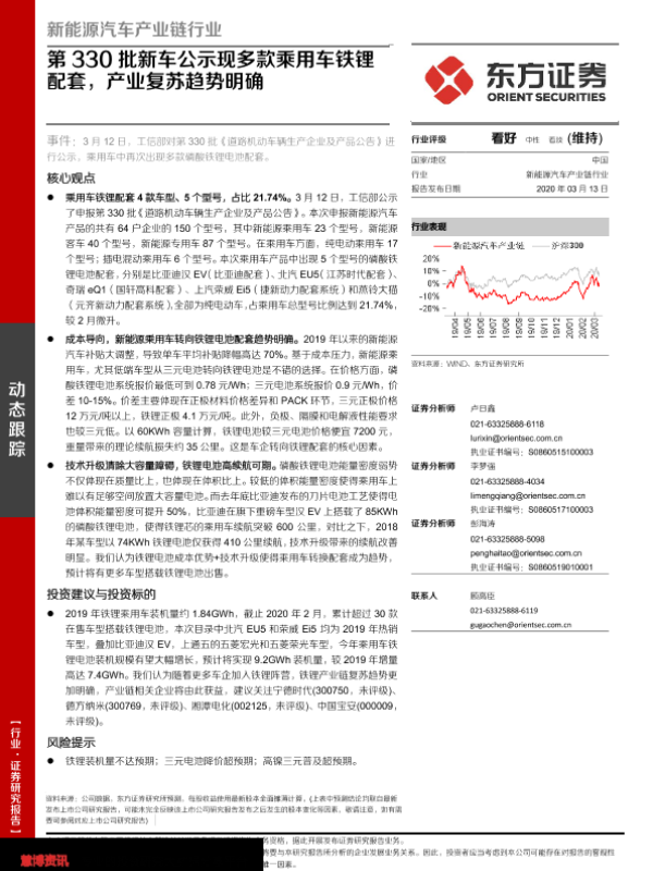 【东方证券】【20200313】第330批新车公示现多款乘用车铁锂配套,产业复苏趋势明确-3页 行业研究