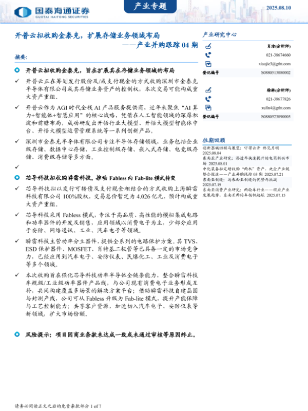 【国泰海通证券】【20250810】产业并购跟踪04期:开普云拟收购金泰克,扩展存储业务领域布局-7页 行业研究