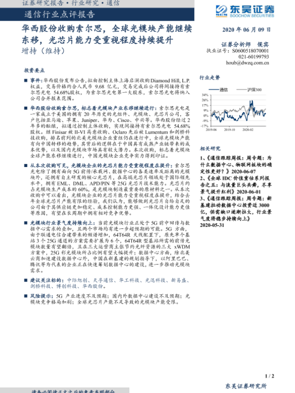 【东吴证券】【20200609】通信行业点评报告:华西股份收购索尔思,全球光模块产能继续东移,光芯片能力受重视程度持续提升-2页 行业研究