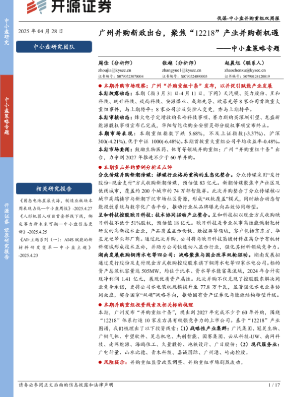 【开源证券】【20250428】中小盘策略专题:广州并购新政出台,聚焦“12218”产业并购新机遇-17页 证券期货研究报告