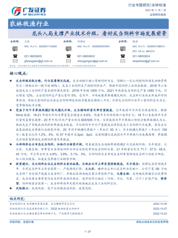 【广发证券】【20221101】农林牧渔行业专题研究:龙头入局支撑产业技术升级,看好反刍饲料市场发展前景-27页 行业研究