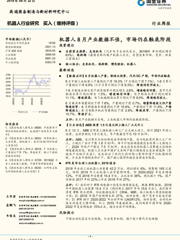 【国金证券】【20190922】机器人行业研究周报:机器人8月产业数据不佳,市场仍在触底阶段-14页 行业研究