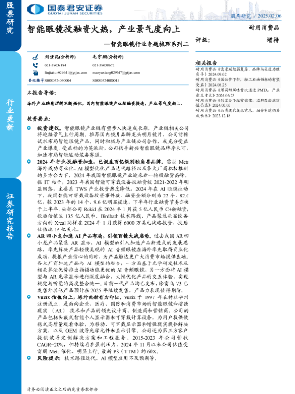 【国泰君安证券】【20250206】耐用消费品行业智能眼镜行业专题梳理系列二:智能眼镜投融资火热,产业景气度向上-10页 行业研究