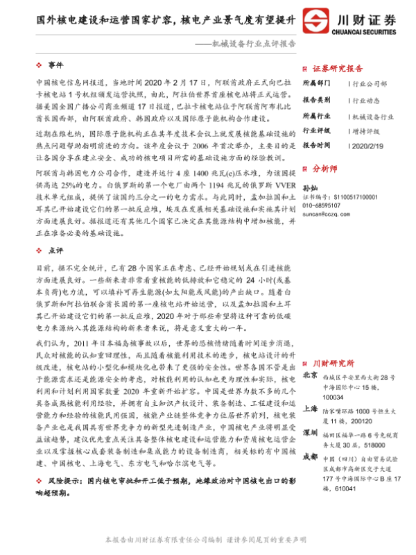 【川财证券】【20200219】机械设备行业点评报告:国外核电建设和运营国家扩容,核电产业景气度有望提升-2页 证券期货研究报告