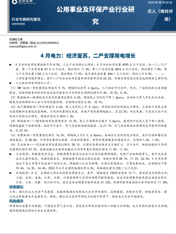 【国金证券】【20230707】公用事业及环保产业行业研究:5月用电,低基数下,二产支撑用电需求修复-17页 行业研究