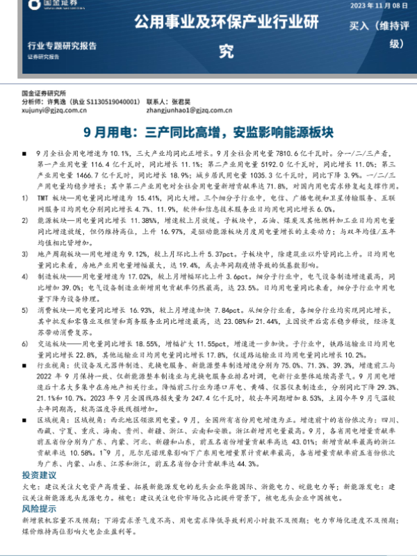 【国金证券】【20231108】9月用电:三产同比高增,安监影响能源板块-16页 行业研究