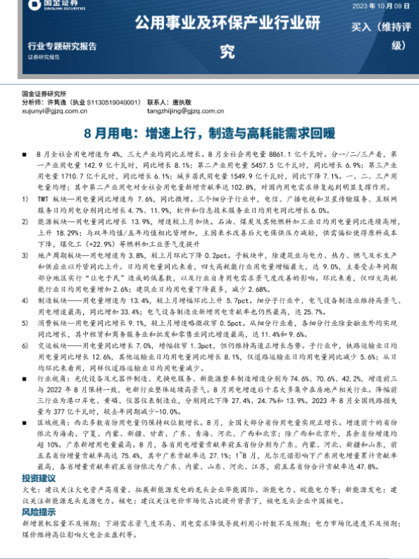 【国金证券】【20231009】公用事业及环保产业行业:8月用电,增速上行,制造与高耗能需求回暖-16页 行业研究