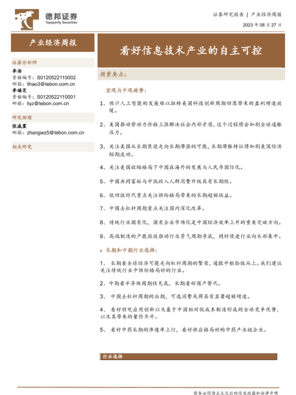【德邦证券】【20230827】产业经济周报:看好信息技术产业的自主可控-24页 行业研究