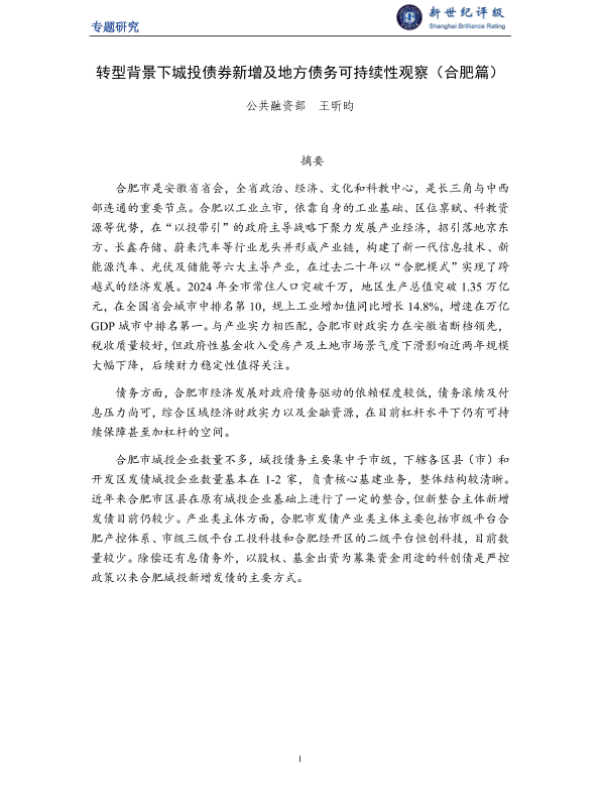 【新世纪评级】【2024】转型背景下城投债券新增及地方债务可持续性观察(合肥篇)-16页 行业研究