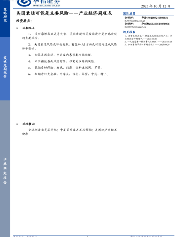 【华福证券】【202510】美国衰退可能是主要风险——产业经济周观点-13页 证券期货研究报告