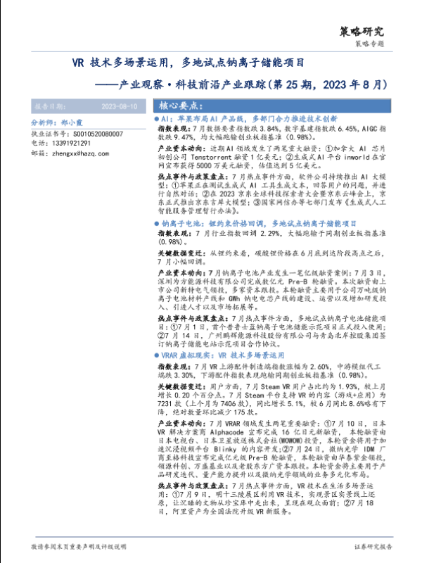 【华安证券】【20230810】产业观察·科技前沿产业跟踪(第25期,2023年8月) :VR技术多场景运用,多地试点钠离子储能项目-30页 行业研究
