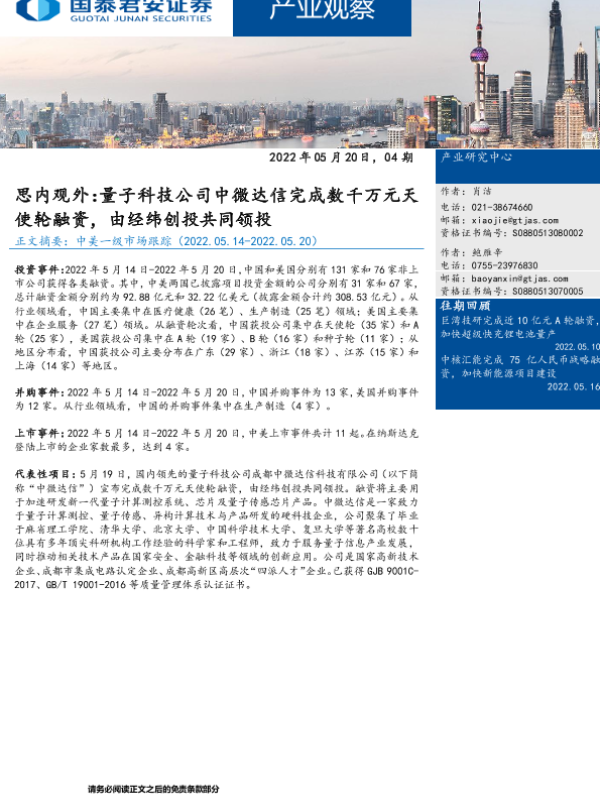 【国泰君安证券】【20220520】产业观察:思内观外,量子科技公司中微达信完成数千万元天使轮融资,由经纬创投共同领投-26页 行业研究