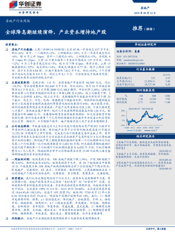 【华创证券】【20190922】房地产行业周报:全球降息潮继续演绎,产业资本增持地产股-22页 行业研究