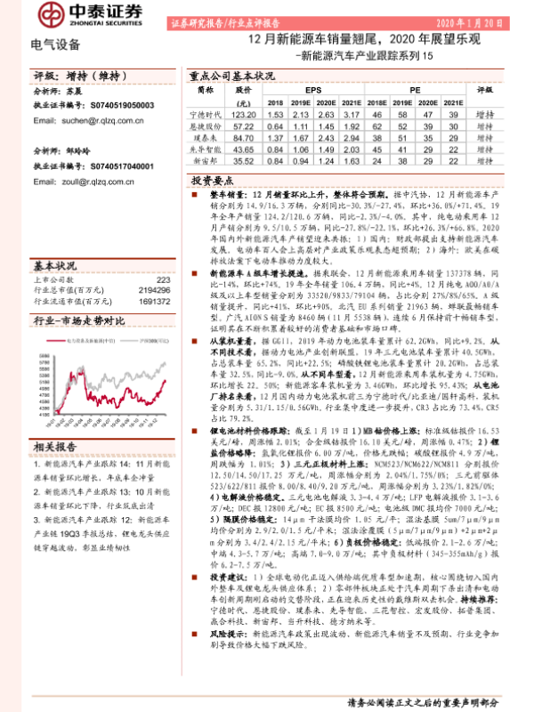 【中泰证券】【20200120】12月新能源车销量翘尾,2020年展望乐观-11页 行业研究