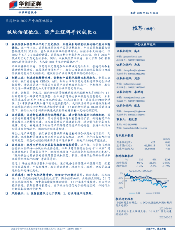 【华创证券】【20220606】医药行业2022年中期策略报告:板块估值低位,沿产业逻辑寻找成长α-45页 行业研究
