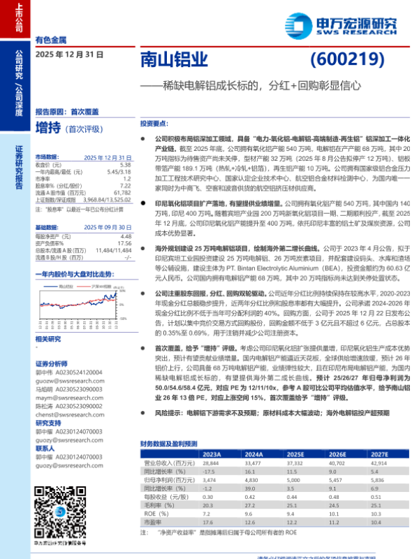 【申万宏源】【202512】南山铝业(600219)稀缺电解铝成长标的,分红+回购彰显信心-28页 证券期货研究报告