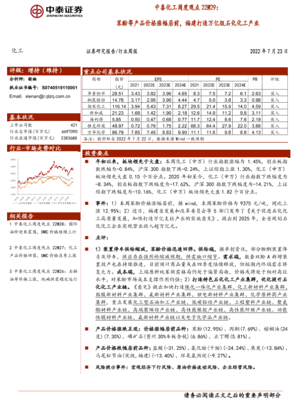【中泰证券】【20220723】中泰化工周度观点22W29:苯酚等产品价格涨幅居前,福建打造万亿级石化化工产业-25页 行业研究