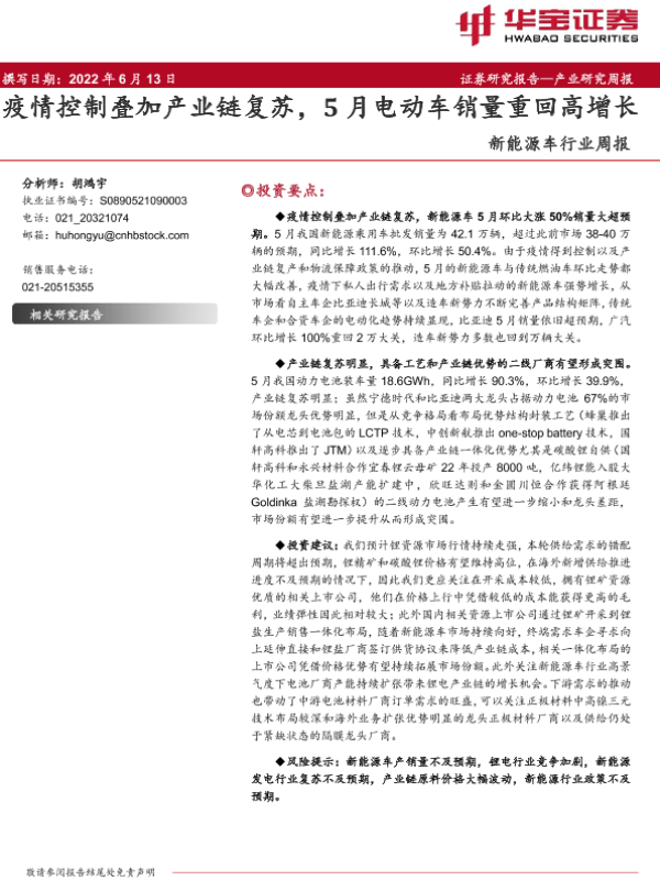 【华宝证券】【20220613】20220613-华宝证券-新能源车行业周报:疫情控制叠加产业链复苏,5月电动车销量重回高增长-10页 行业研究