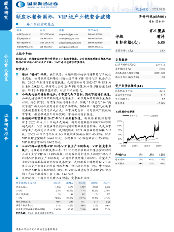 【国泰海通证券】【202508】顺应冰箱新国标,VIP板产业链整合就绪——再升科技首次覆盖-11页 证券期货研究报告