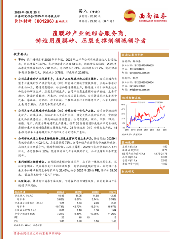 【西南证券】【202508】长江材料2025年半年报点评:覆膜砂产业链综合服务商,铸造用覆膜砂、压裂支撑剂领域领导者-13页 证券期货研究报告