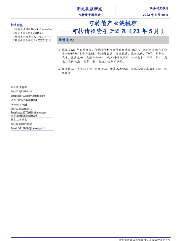【海通证券】【20230510】可转债产业链梳理——可转债投资手册之五(23年5月)-26页 行业研究