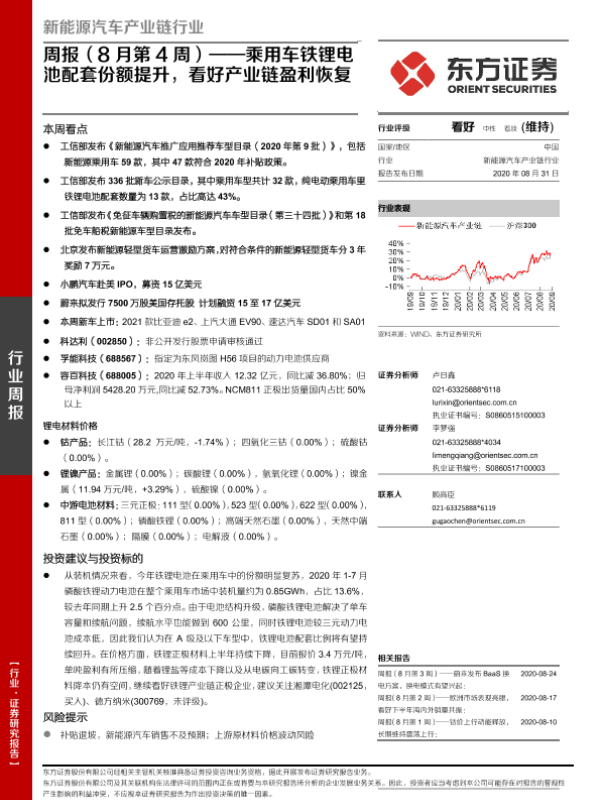 【东方证券】【20200831】新能源汽车产业链行业周报(8月第4周):乘用车铁锂电池配套份额提升,看好产业链盈利恢复-25页 行业研究