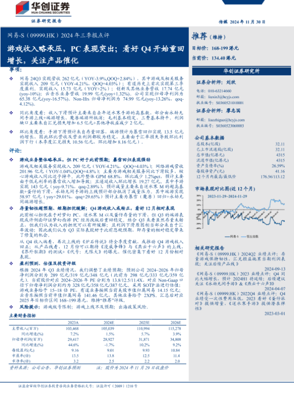 【华创证券】【20241130】网易-S(09999.HK)2024年三季报点评:游戏收入略承压,PC表现突出;看好Q4开始重回增长,关注产品催化-14页 财报