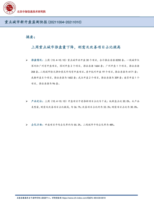 【中指研究院】【20211010】重点城市新开盘监测快报-4页 市场调研
