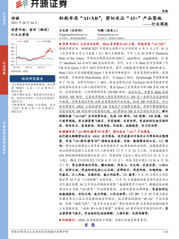 【开源证券】【20230604】传媒行业周报:积极布局“AI+XR”,密切关注“AI+”产品落地-14页 行业研究